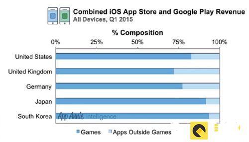 另外一项关键数据是:2015年第一季度,在日韩两国,iOS和Google Play超90%的收入来自移动游戏——而移动游戏在美国和英国移动应用总收入的占比则分别为80%和70%。