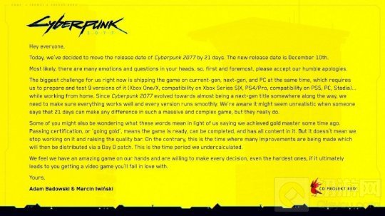 今天,我们决定将《赛博朋克2077》的发售日期延后21天。新的发售日期为12月10日。
