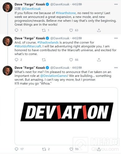 近日,前《炉石传说》首席设计师,《魔兽世界》首席剧情设计师Dave Kosak在推特正式宣布从暴雪离职,Dave Kosak表示会很想念共事十二年的暴雪同事。目前Dave Kosak加入了Deviation Games工作室,同时在开发一个秘密项目,目前还不能透露项目的信息。