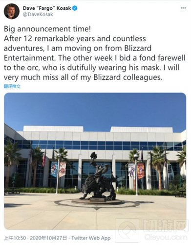Dave Kosak表示:“在经历了12年峥嵘岁月和无数冒险之后,我离开了暴雪并将继续前进。在此之前,我向兽人雕像深情道别。我会很想念我所有的暴雪同事。”