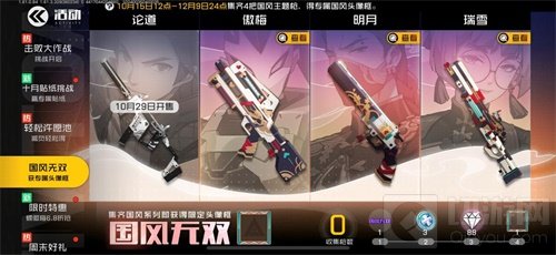 “国风无双”活动期间,玩家收集四把国风武器“蝶·傲梅”(限时特惠)、“迷雾·明月”(S6通行证)、“雪·瑞雪”(S6通行证)、“飞将·论道”(10月29日开售),即可解锁“国风无双专属头像框”、“称号-国风无双”、“复活币”、“钻石”等奖励。该活动将于12月9日24点结束。