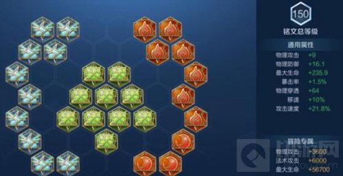 蓝色10狩猎,绿色10鹰眼,红色3红月7宿命,铭文属性在右边,大家看下,因为新赛季的游戏节奏相对变快,所以在铭文中,我们选择了让程咬金有更高的伤害。