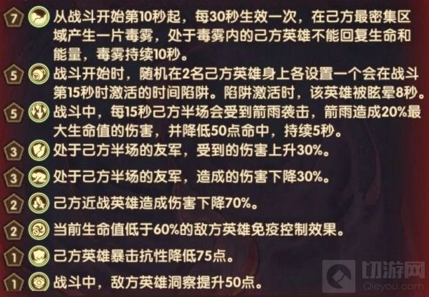 上面就是哭壕荒漠的规则了,不同的试炼玩家就会受到不同的伤害,在战斗的时候玩家就要选择不同的阵容,在战斗的时候玩家会受到试炼施加在自己阵容身上的debuff,玩家要选择不同的英雄来进行克制才能够成功的通过试炼来获得奖励。玩家可以按照小编推荐的阵容来进行通关,这样就能够更快的获得游戏奖励了。