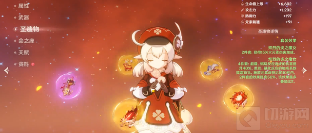 下来说武器和圣遗物,武器选择五星四风原典,四星流浪乐章,没有的话就依次用天空之卷,昭心,匣里日月,万国诸海图谱,圣遗物主属性选时之砂攻击,空之杯选火属性伤害加成,理之冠暴击率和暴击伤害。副词条选暴击率,暴击伤害,攻击力,元素精通,优先把暴击率堆到60,爆伤堆到150,再考虑其他属性,套装用炽烈的炎之魔女,