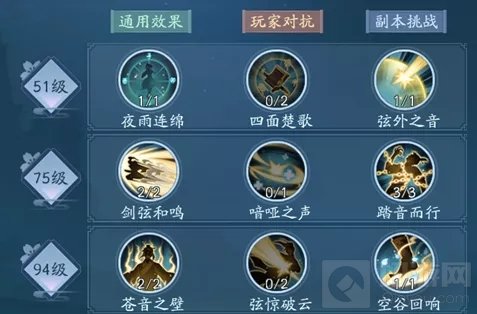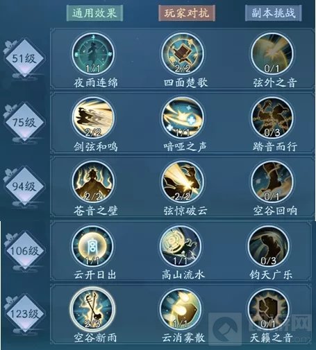 2、回血:空谷新雨心法强化后,可以在自身血量达到30%的时候,为队友恢复15%的血量,不算多,但是比没有好。 惊弦的技能循环:(此处的重点是时刻保持潇湘夜雨的充能状态,保证自己的乐符资源可以源源不断,从而加强各个曲调的效果,让团队的全属性得到爆炸提升!!!)
