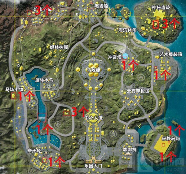 首先为各位玩家附上荒野行动中荒野乐园地图中共计16处杰克的宝箱的具体位置参考图如下: