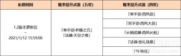 活动期间,四星武器「单手剑·西风剑」「双手剑·西风大剑」「长柄武器·西风长枪」「法器·祭礼残章」「弓·绝弦」的祈愿获取概率将大幅提升!