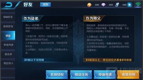 拜师条件等级为5-20级;当前没有师父收徒条件等级为21-30级;排位段位在黄金3及以上;当前没有师父,或者已经出师;拥有的徒弟数量未达上限