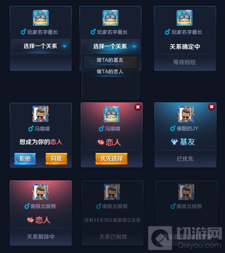 关系条件当我们和好友亲密度满时,可以和好友建立不同的关系。在双方同意的情况可以建立和解除关系。