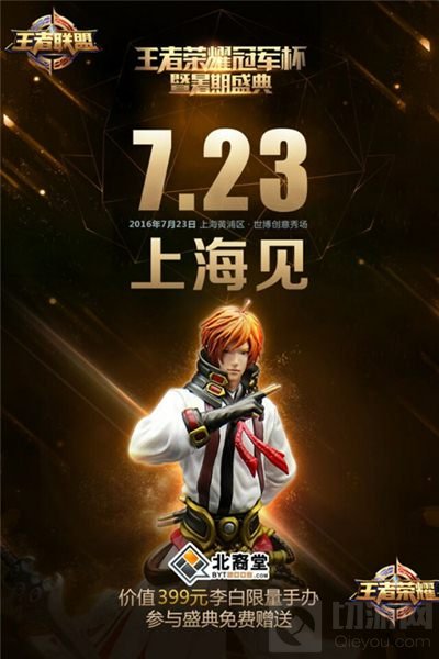 腾讯第一5V5英雄公平对战手游《王者荣耀》“王者冠军杯暨暑期盛典”即将于2016年7月23日在上海世博创意秀场举行。日前,《王者荣耀》再次曝光一组暑期盛典宣传海报,广受玩家喜爱的青莲剑仙“李白”成为主角,为暑期盛典强势站台!据悉,参与本次暑期盛典的玩家都将免费获得由北裔堂出品的,价值399元的青莲剑仙——李白限量手办!7月23日当天,更有诸多互动活动、赛事比拼与游戏福利燃爆你的夏日激情!