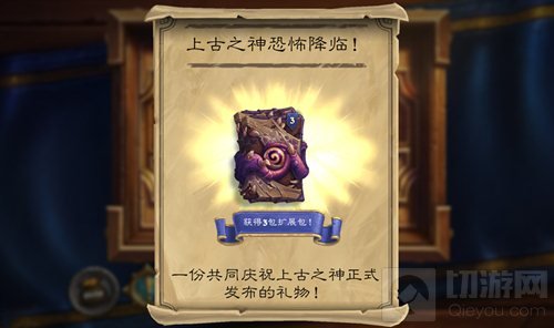请别介意上古之神的不请自来,它们可是带着见面礼的哟!随着扩展包的正式发布,玩家只要登录《炉石传说》,就可立即免费获得3包“上古之神的低语”卡包。