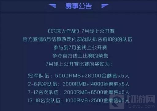 7月球球线上公开赛参赛队伍由6月战队排行榜前18名战队构成,周六为比赛日,本次赛事同样为参赛战队准备了丰富的虚拟道具奖励。球宝们想要参加比赛的话,就努力提升战队排名吧!