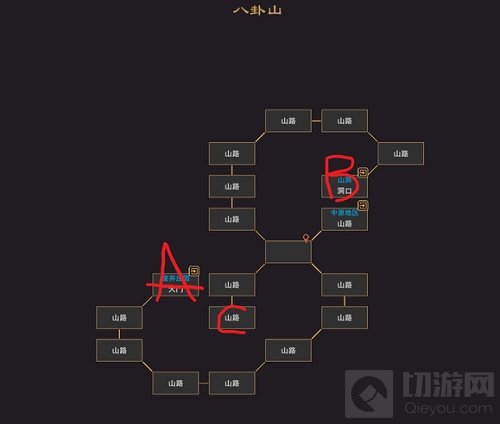 1.有三个入口ABC,A和B是存放钥匙的洞穴,C是隐藏的入口,钥匙在这里用来存放功法的残迹。