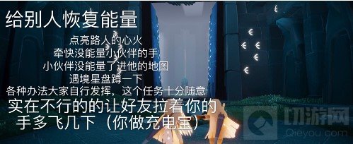 ①给其他玩家传送能量:给耗尽能量的玩家恢复能量(喊叫、牵手、点燃蜡烛),和朋友手拉手进入地图,去云野点亮一个没有翅膀的玩家,真的不可能 让朋友拉你的手飞几次(你做一个移动电源)。