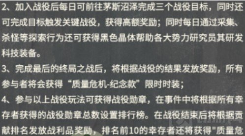 2、更多详情请看图片,以上就是明日之后质量危机回归活动介绍,更多明日之后近期攻略可以到下方相关攻略查询哦,希望可以帮到你。