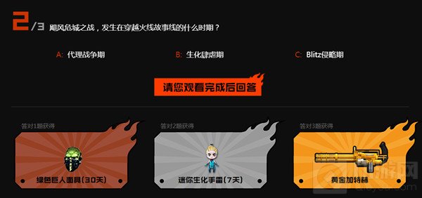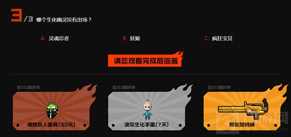 参与答题可以获得:绿色巨人面具(30天)、迷你生化手雷(7天)以及黄金加特林的奖励。