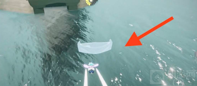 3、看完动画之外,玩家要飞到小船尾部的前方,在灯塔下面有一个小船,玩家需要飞到小船上去潜入到海中,具体如下图。
