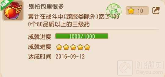 成就内容: 累计在战斗中(跨服类除外)吃了1000个80品质以上的三级药