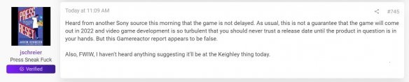 Jason Schreier表示,他从又一位索尼内部人士那里听说:《战神5》没有延期。而且昨天已经有2个人向他透露《战神5》没跳票到2023年。他认为Gamereactor关于《战神5》跳票到2023年的消息应该是假的。不过他也指出:游戏开发本身充满了变数,有很多不可控因素,所以在游戏真正拿到手里之前,发售日期都是有可能改变的。