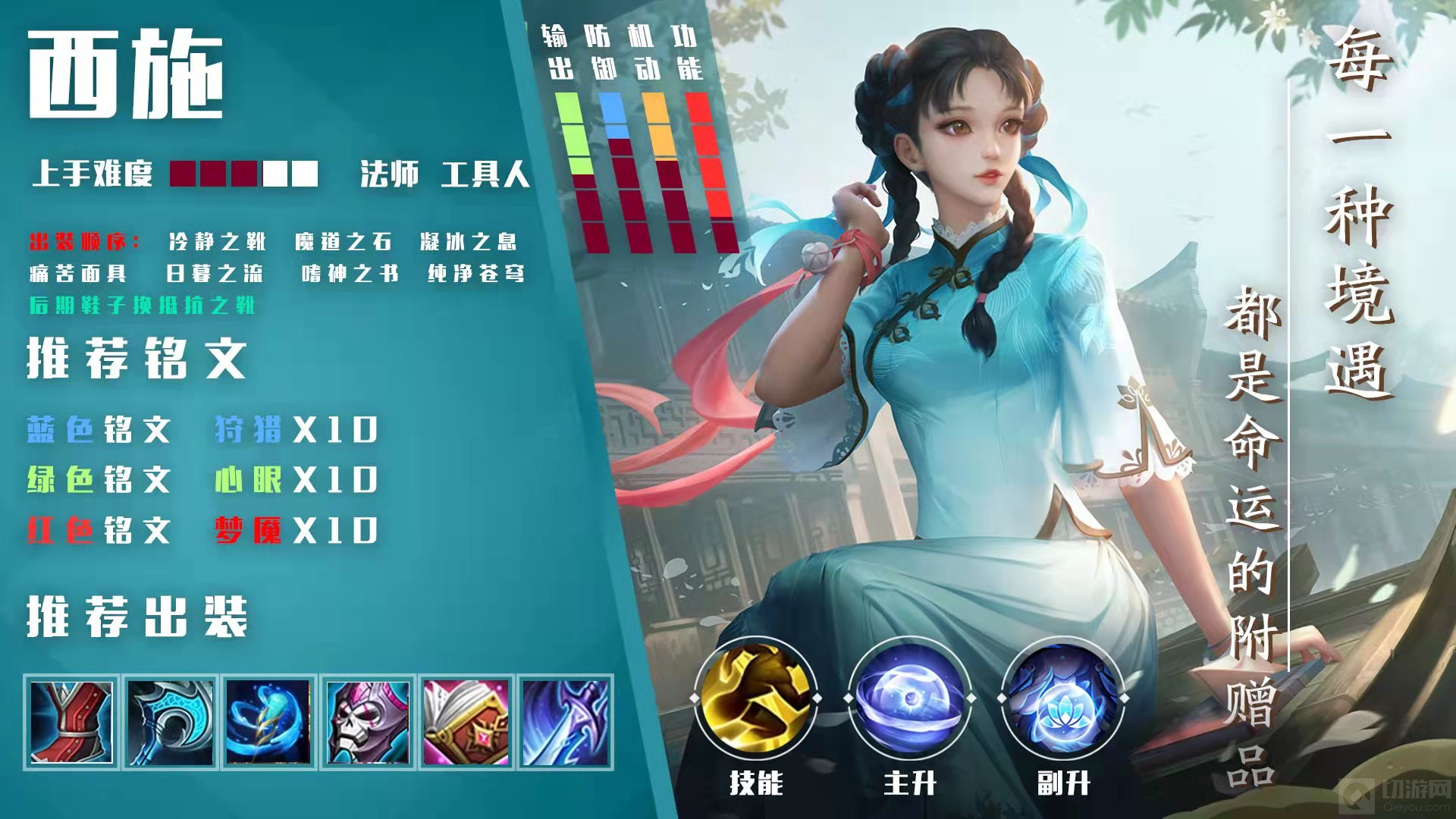 这套就是“罚站流”西施的铭文出装,其实整体和西施常规铭文出装也没什么太大的区别,依旧是以面具加日暮来打主要伤害的,只不过把保命装从辉月换成苍穹,用更高的伤害来换取了更充足的控制效果。