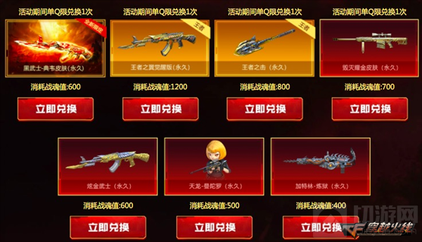 在本次活动中,CFer消耗抽取到的战魂值可以兑换炫金武士(永久)、王者之击(永久)等奖励。部分奖励在活动期间仅限兑换一次,有意向的CFer千万别错过!