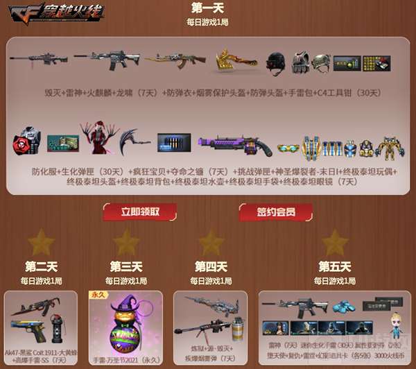 签约后的CFer,在活动期间登陆并游戏一局即可在Barrett-飞龙在天(永久)、绿色烟雾弹(永久)等5种道具中随机抽取。回归老兵可以每天无条件选择一件包含Barrett-朱雀(7天)、龙啸(7天)在内的期限道具进行领取。