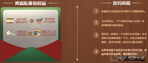 加入灵狐私享会还可以享受每天黄金体验卡,每月免费CFvip资格及专属道具体验资格。玩家签约后只需要每月加入游戏一天,即可持续保障权益180天以上。