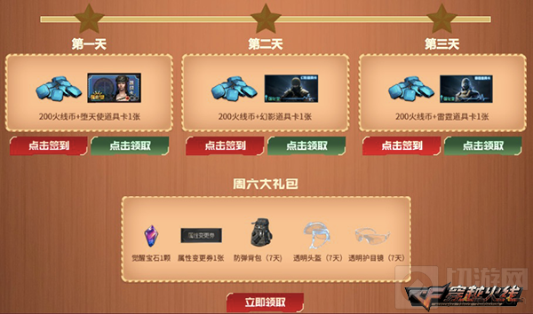 活动期间,CFer在周一至周五累计签到3天,即可在周六或周日领取包含觉醒宝石、透明头盔(7天)、透明护目镜(7天)等道具在内的周末礼包,礼包仅可领一次,每周刷新资格。CFer当天登录游戏即可视为签到一次,每次签到均可领取火线币及道具卡奖励。