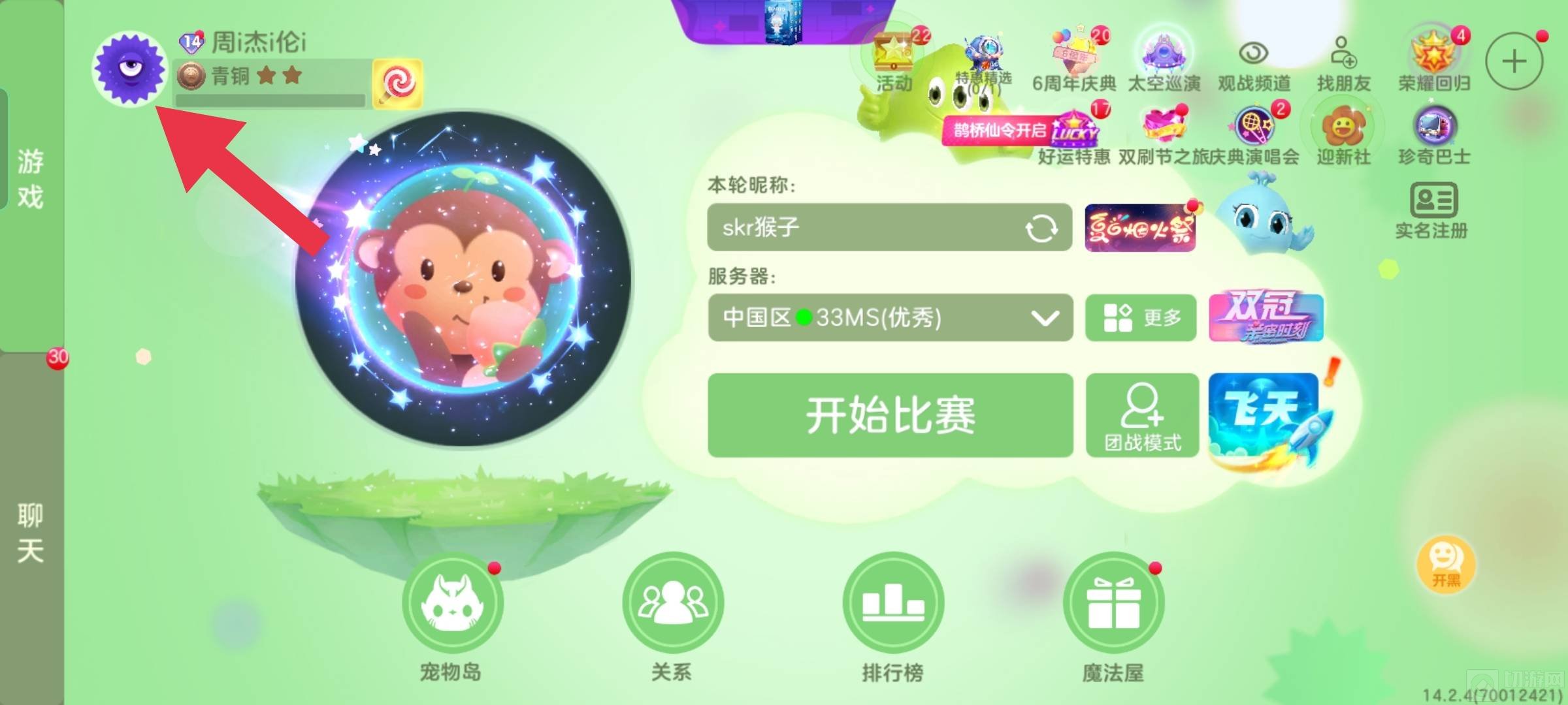 1.打开球球大作战手游APP,在游戏大厅界面点击左上角我的头像。