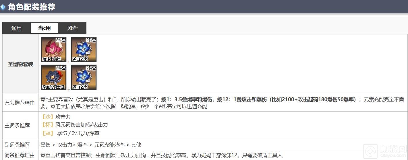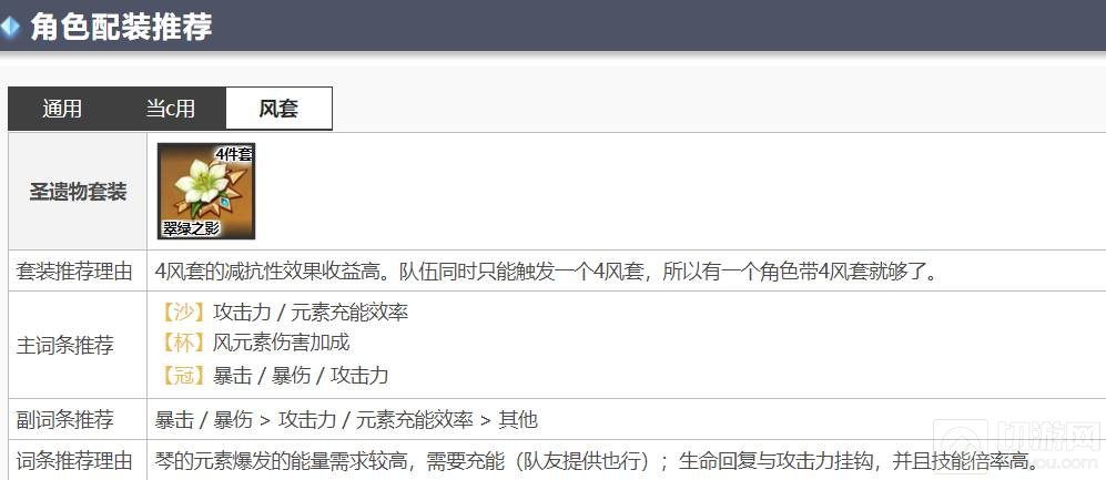 2、圣遗物主词条推荐【沙】攻击力 / 元素充能效率,【杯】风元素伤害加成,【冠】暴击 / 暴伤 / 攻击力。副词条推荐暴击 / 暴伤 >攻击力 / 元素充能效率 >其他。圣遗物词条推荐理由;琴的元素爆发的能量需求较高,需要充能(队友提供也行);生命回复与攻击力挂钩,并且技能倍率高。
