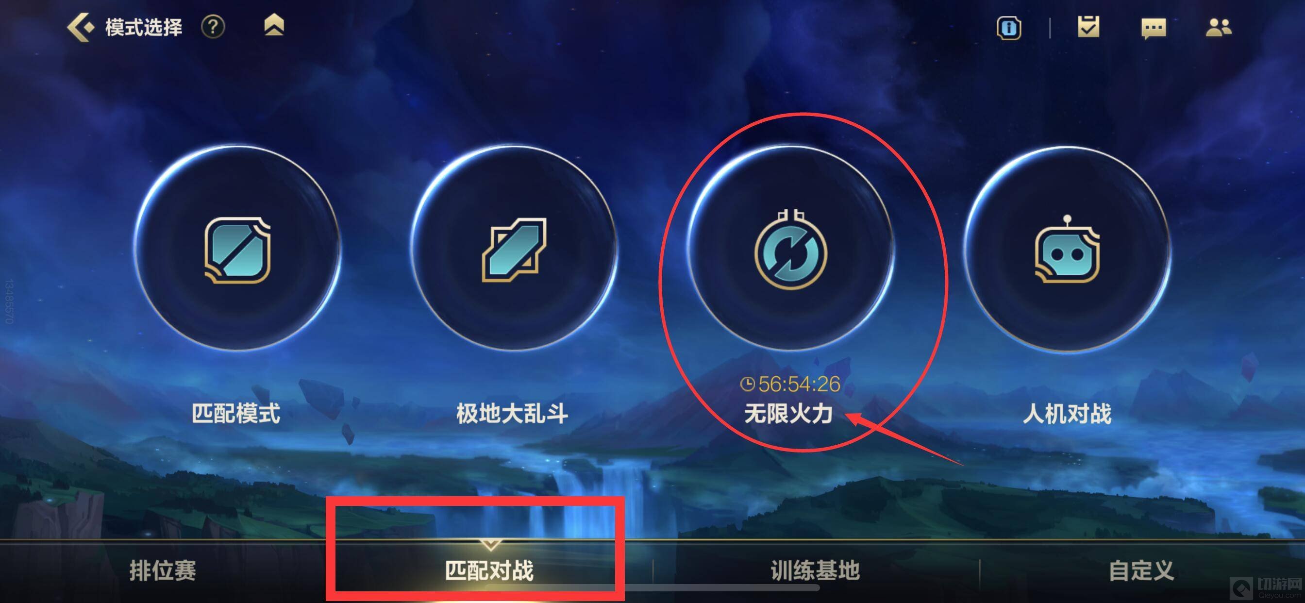2、进入之后选择正下方的匹配模式选项,然后就可以看到无限火力模式入口了。