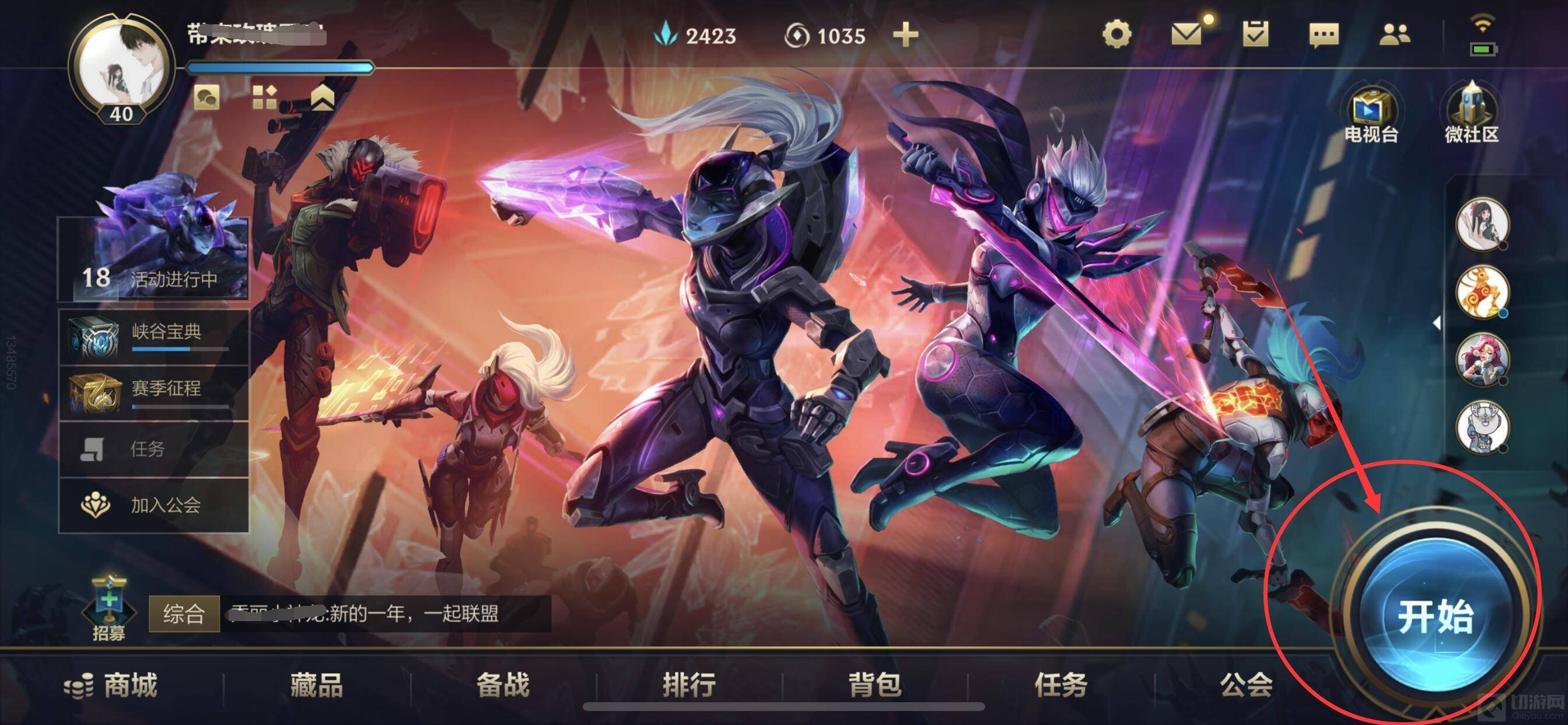 1、在游戏的主页大厅中,找到右下方的‘’开始‘’图标选项,进入到对局模式页面。