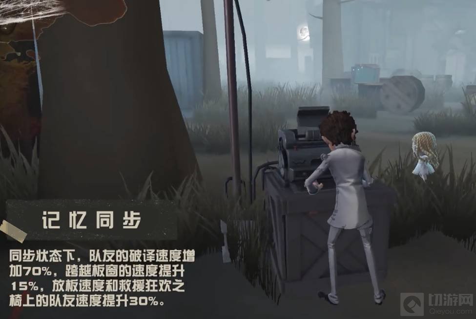 “小女孩”可以与附近的队友产生记忆同步,“小女孩”将跟随队友一起移动和交互, 同步状态下,队友的破译速度增加70%,跨越板窗的速度提升15%, 放板速度和救援狂欢之椅上的队友速度提升30%。“小女孩”在同步状态下可以使用回忆碎片。“小女孩”在同步状态下,监管者无法通过攻击和技能命中“小女孩”。