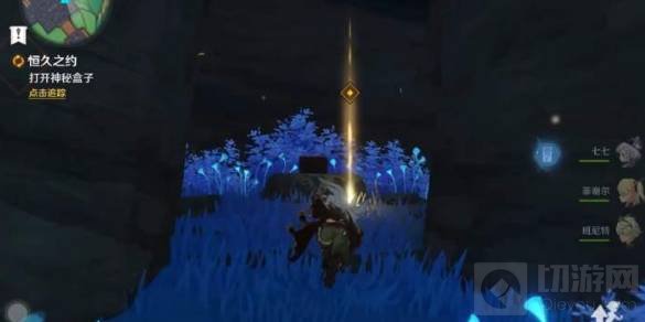 3.继续调查其他蓝色植物背后的石壁, 打碎后触发「恒久之约」任务,前往调查神秘盒子获得笔记。