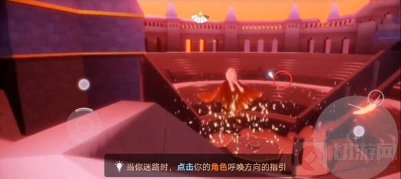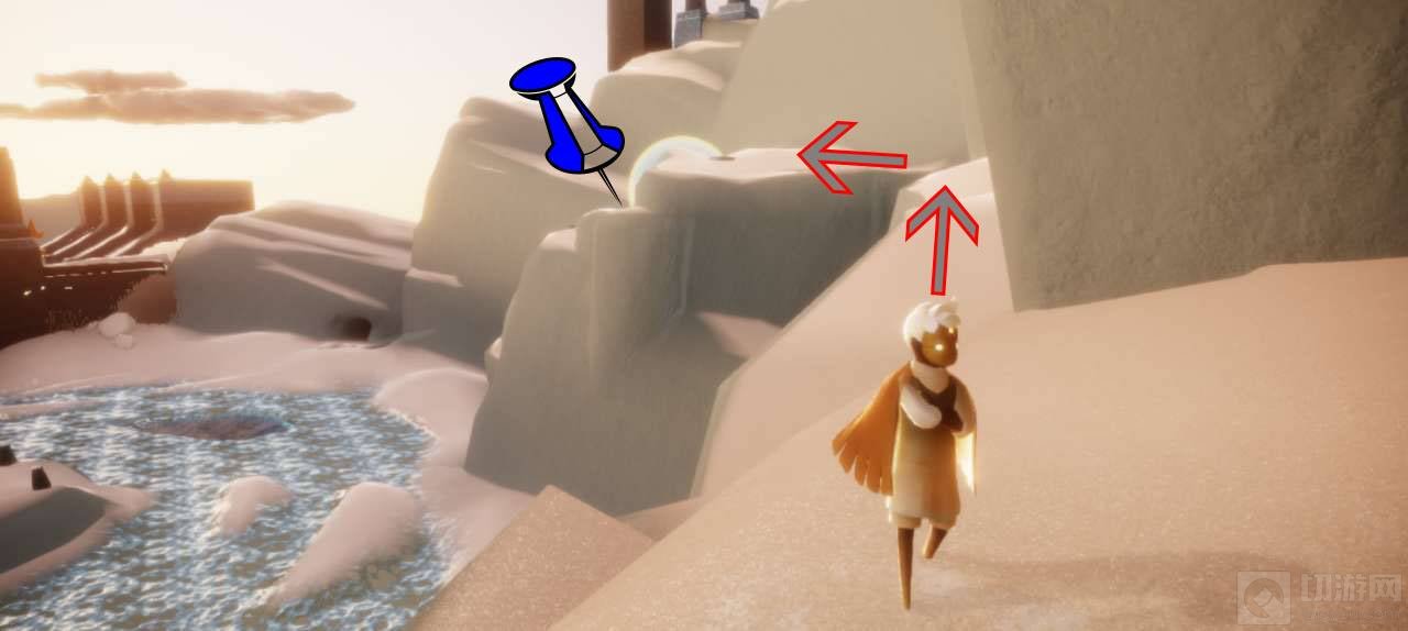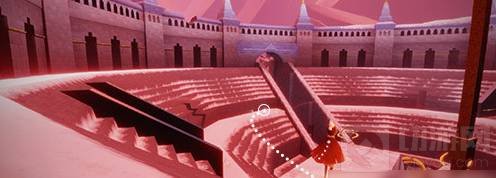 2、鞠躬先祖:在滑冰道这里,主要有两个入口,左边的暂时进不去,需要2个先祖,所以我们先前往这个右边这个入口。进入之后,然后一直飞到尽头,可以来到落日竞技场这里。然后可以在这个竞技场这里,看到左右两个滑梯,在右边的楼梯这里,可以找到鞠躬先祖。