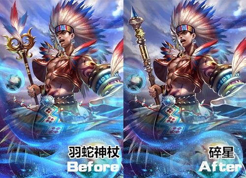 同时,周洪已有皮肤“羽蛇祭司”中配套的武器也将同步进行更换,武器“羽蛇神杖”将更换为“碎星”。武器仅是更换外表,所附加的属性不变哦!