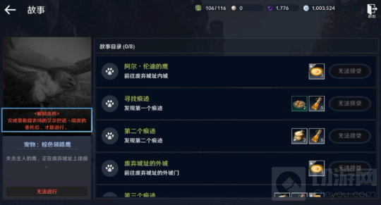 之后我们再点进[菜单]--[故事]--[宠物],就会发现领路鹰的任务出现了。根据提示要解锁任务需要我们去莫勒提农场找到艾尔巴诺·堤度接受委托【无尽的忠诚】。讨伐3次阿尔·伦迪,需要消耗90点行动力或3张讨伐券(tips:建议同时接受公会任务[完成1次讨伐])。