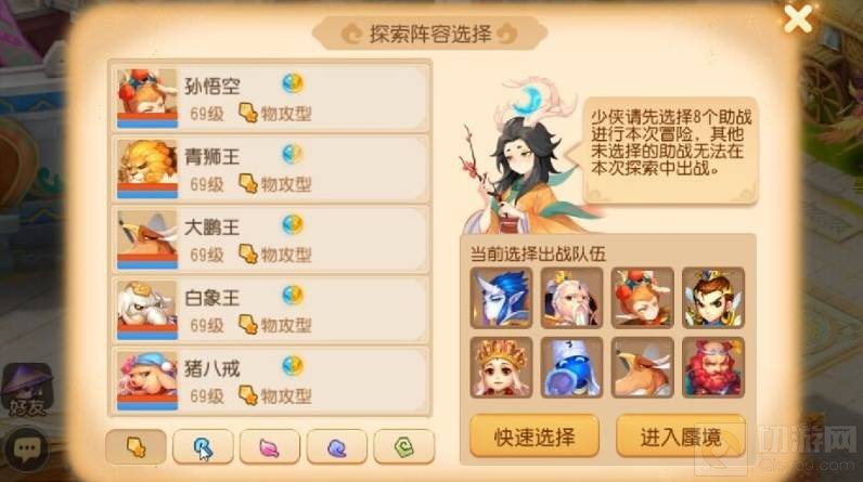 2、接着是选择8个助战,选阎罗王、菩提祖师、孙悟空、惠岸行者、唐僧、白无常、大鹏王和沙悟净。选好后点击进入蜃境即可。