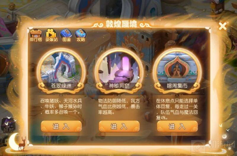 1、敦煌秘境在游戏中称为敦煌蜃境,进入敦煌蜃境前有三个房间,每个房间提供的增益都不同,可以选择一个进入,推荐进入第二个房间,增加伤害,打BOSS比较好打。