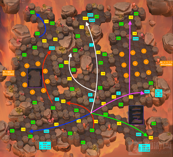 7、确定粉线全线资源都领取后,再回来走一次绿线,再次启动机关B,把右侧区域封闭,这样中间区域就全被打开咯。