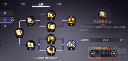 2、既然职业的定位就是治愈系的辅助,那光属性就是比较常规的选择。祭司的七个技能中,有四个是回血技能,因此选择光属性后,还需要优先将下行的天赋树点亮,下行的治疗强化、圣光涌动强化和圣光回响强化,都能让治愈能力得到大幅度提升,而最后的这个紧急救援,更是能让50%血量以下的队友,在获得治愈时以百分比的幅度提升治愈效果,在多人组队团本时,或者是在多人PVP竞技时点光属性,是比较合理的选择。