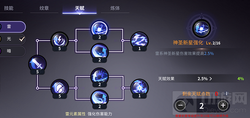 3、那为什么不选择雷和暗元素的天赋呢?先看雷元素,雷元素最主要提升的就是攻击伤害,就祭司职业来说,伤害型的技能就三个:神圣新星、裁决之眼和连锁天罚,且不说其伤害是高还是低,但专为三个伤害型技能点亮主加伤害的雷属性,这样带来的收益其实并不高,况且祭司的这三个技能在团战中的伤害并不高,因此选雷属性实属有些鸡肋了,但如果是做单人副本或者是单人剧情,那就可以选择雷属性了,提升完成任务的效率。