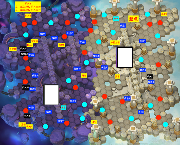 1、在起点位置,走向永恒之书,触发剧情,随后进入传送1对面区域,清除小怪(3个小能量),然后前往传送3清除小怪(2个小能量),找到机关1触发剧情