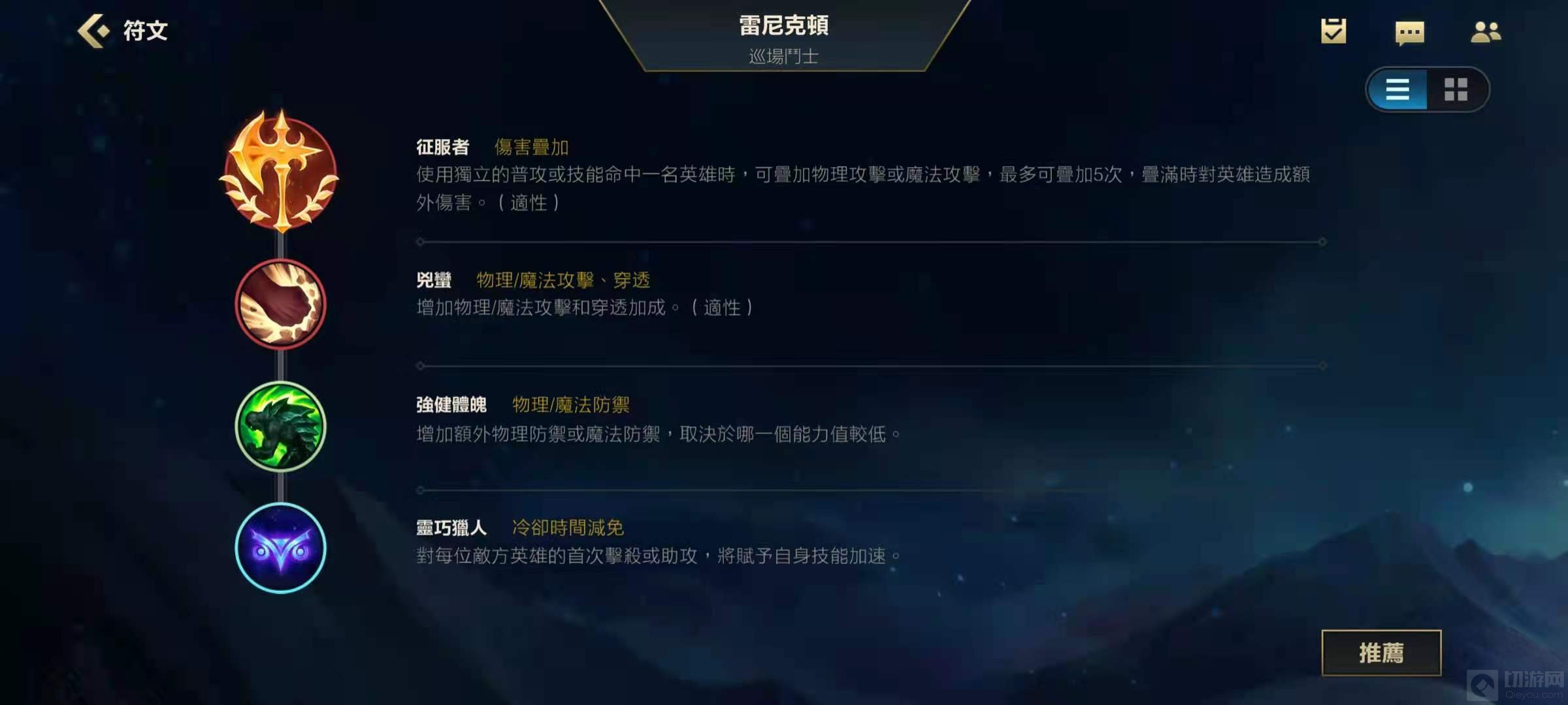 选择征服者、残暴、巨人猎人和猎人天才。这套符文输出对自己前期的压力有信心的做法,可以增加后期的属性和前期滚雪球的能力,也是灵药推荐的天赋!