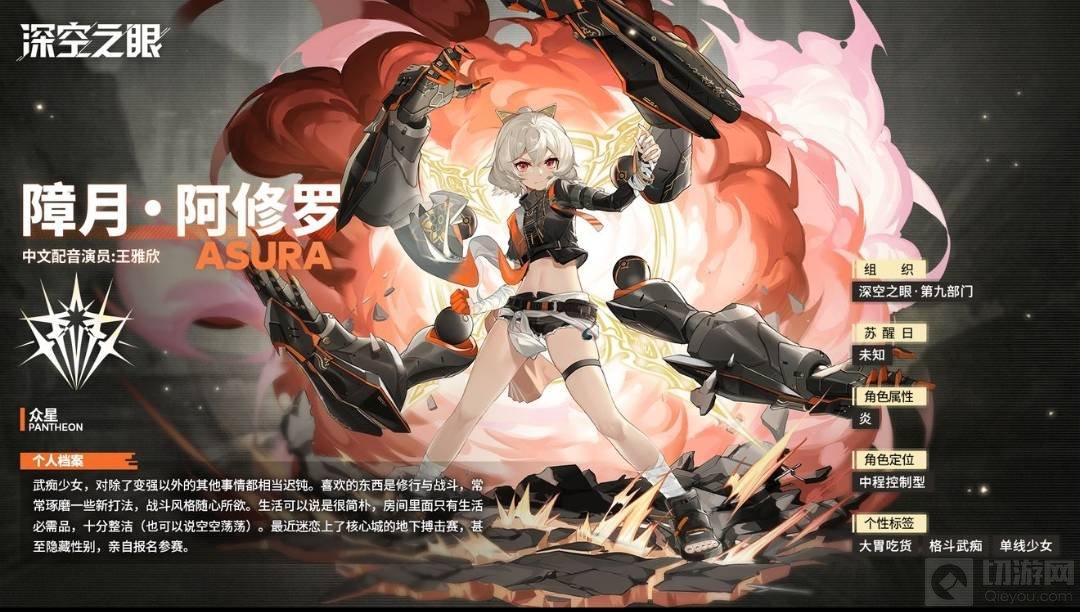 一、阿修罗,初始S级火属性角色,属众星阵营。以成为世界最强为目的到处挑战强者的武痴少女。