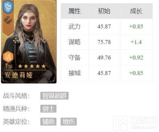 安德莉娅为辅助和增伤英雄,主要技能为戎装公主和励振军心。