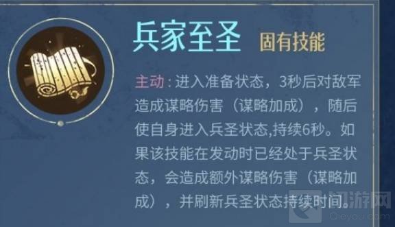 进入准备状态,3秒后对敌军造成谋略伤害(谋略加成),随后使自身进入兵圣状态,持续6秒。如果该技能在发动时已经处于兵圣状态,会造成额外谋略伤害(谋略加成),并刷新兵圣状态持续时间。