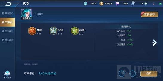 2.铭文搭配:10梦魇 10狩猎 10心眼。梦魇提供法强和法穿,增强王昭君伤害能力,狩猎提供的攻速帮助王昭君更好地打出平A被动,提高手感,由于王昭君本身是没有位移的,狩猎提供的移速提高王昭君机动性,心眼提供的攻速和法穿同理。