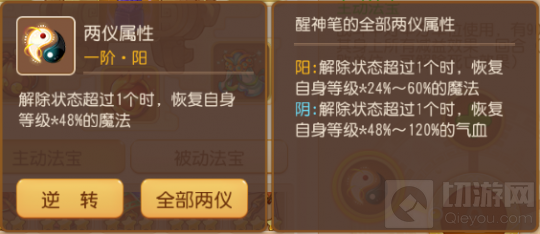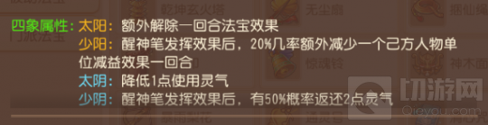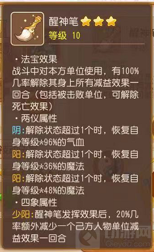 太阳属性并不推荐,我们完全可以通过七宝玲珑灯、清心咒来解除身上的法宝效果;少阳属性可以使用,唯一缺点就是20%的概率相较不会太高。至于太阴、少阴都是减少灵气值的消耗。醒神笔灵气消耗高达6点,对比我们常用的番天印3点、无魂傀儡4点、苍白纸人5点、乾坤玄火塔6点确实高了一些,毕竟后者都是持续性法宝,平均到每回合消耗很有限,醒神笔仅仅是一回合的效果,这样的灵气消耗量确实高了。