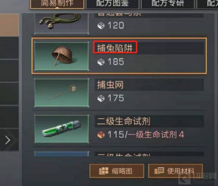 1、先在配方里制作捕兔陷阱,然后在兔子洞口摆放。